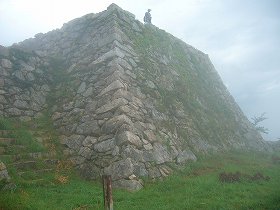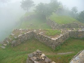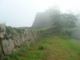 | 天守台の北側にも、複雑なクランクをした石垣があった。 | 霧が晴れた南千畳。 |