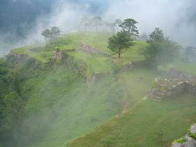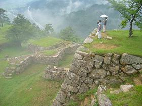06年7月15日(土)、ついに念願叶ってヤブレンジャーツアーでこの城を訪れる事ができた。この日の天候はあいにくの雨、しかも夕方であり、薄暗くなりつつあった。それでもめげずに傘を差して城に登っていった。辺りには霧が立ち込めていて、城の様子を隅々までよく見ることができないような状況であった。しかし山の天気は変わりやすい。しばらく城内にいるうちに天気はみるみる回復していき、霧はしだいに晴れ上がり、やがて本丸から遠くの山まで遠望できるようになっていった。次第に霧の中から遠くの石垣が姿を現していくさまは、感動を通り越して神秘的でさえあったといっていい。こうした雰囲気こそ、まさに名城と呼ぶにふさわしい。ただ石垣がたくさん積まれているだとか、景色がいいだとかいうのは別のオーラのようなものがこの城にはあるのである。日本の代表的な山城といえば、高取城、岩村城、備中松山城が3大山城であると言われているが、どうしてこの城が入っていないのかが不思議である。古城としての雰囲気のすばらしさでいえば、竹田城はこれら3城以上であるとさえいえるであろう。