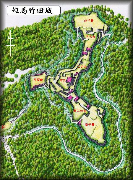 | 竹田城はもともとは山名氏の家臣で、但馬生え抜きの国人であった太田垣氏の城であった。といっても、そのころは当地域にありがちな、単純な構造の山城であったものだろう。そして、城主の平素の居館は山麓に営まれていたであろう。 戦国期になると山名氏の勢力も衰え、太田垣氏は独立勢力のようになっていく。天正年間になると、中国地方の大勢力毛利氏は但馬地域にもその勢力を伸ばしつつあった。一方織田氏も、羽柴秀吉に中国地方攻略を命じたため、但馬地域は織田勢力と毛利勢力の衝突地帯となっていく。結局、毛利氏よりも羽柴氏の方が、早め早めに手を打ち、但馬の諸城を従える事に成功した。竹田城も羽柴氏の手に入っているわけであるから、太田垣氏は降伏するか、抵抗して滅亡するかしたのであろう。その詳しい経緯については不明であるが、その後秀吉の配下に太田垣氏の名前を見ることができないので、その後、武将として存続する事はできなかったのであろう。 上記の通り、天正年間以降、この城には桑山重晴、赤松広秀らが城主として入城した。特に赤松氏の支配時代は長く、天正13年から慶長5年にまで及んでいる。 慶長5年の関ヶ原の役で、西軍に属した赤松広秀は、丹後の田辺城攻撃に参加した。しかしその戦いの最中、関ヶ原で西軍が敗れた事を知り、慌てて竹田に引き上げていった。その後東軍に属した亀井茲矩に協力して、鳥取城を攻撃したが、その際に、城下に火を放って延焼させた。後にそのことを家康に詰問されて、鳥取で切腹して果て、ここに赤松氏は断絶した。城下に火を放ったことへの責任といわれているが、実際のとこr、西軍に加担しておきながら関ヶ原の敗報を聞いて、途中で寝返った広秀を家康は快く思っていなかったのであろう。その後、竹田城も廃城となったといわれる。 |