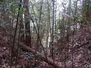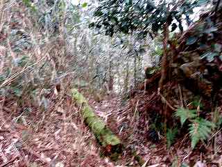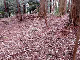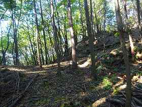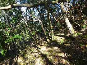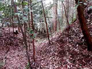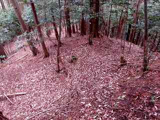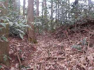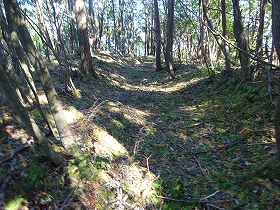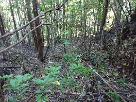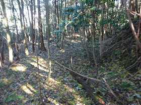 そこを過ぎていくと堀切がある。堀幅があり、深さはそれほどでもないので、あまり鋭さは感じられないが、このすぐ上が主要部分である。登城道はここから左手の山すそを通るようになっている。
