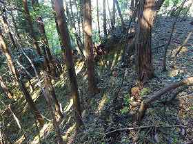 後はそのまま斜面を直登して行ったら、4郭に出た。4郭の東側には小規模な堀切が掘られているが、西側は自然傾斜で5郭と接続している。