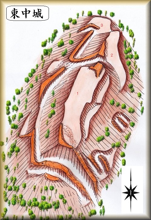 東中の集落にそびえている比高20mほどの台地が東中城の跡である。