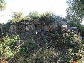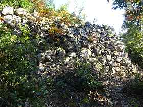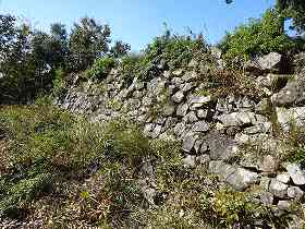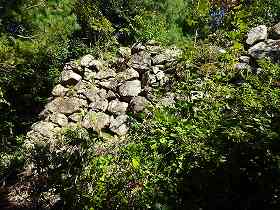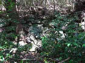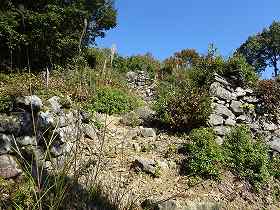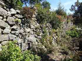 | 堀切から進んでいったところに井戸の跡がある。石組みのしっかりとしたもので、現在も水を湛えている。 | その先の通路脇の斜面に築かれた石垣。 |