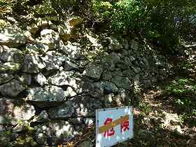 現在のルートを進んでいくと、石垣囲みの小規模な郭の周囲を巡るようにして5の下に出る。5の下の石垣には「危険」という注意表示があったが、崩落の危険性があるということなのだろうか。いずれにせよ、遺跡保護のためにも石垣にはあまり近寄らない方がよいかもしれない。