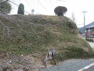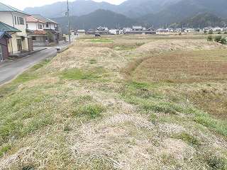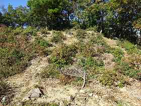 | 東南からの遠望。比高20mほどの山稜である。 | 3郭の土塁。脇に竪堀がある。 |