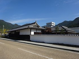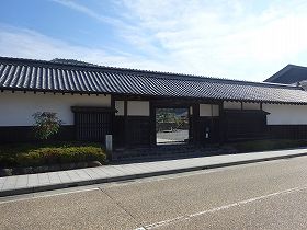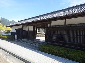 | 道路沿いに見る柏原陣屋の長屋門。御殿の屋根も見える。 | 現存の長屋門。 |