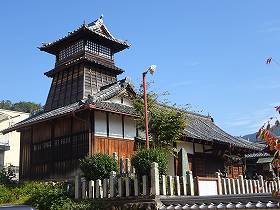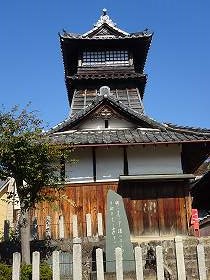 現存建造物はもう1つあって、太鼓櫓という3階建ての櫓が残されている。しかし、こちらは移築されているので、探すのにちょっと苦労する。市街地の中を西側に進んでいったこの位置に現在は移築されており、大歳神社の隣接建造物となっている。場所は分かりにくいが、道路沿いに案内があり、駐車スペースもちゃんと2台分用意されているので、たどり着ければ簡単に見学できる。ただし内部に入ることはできない。