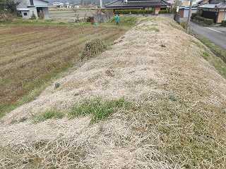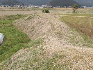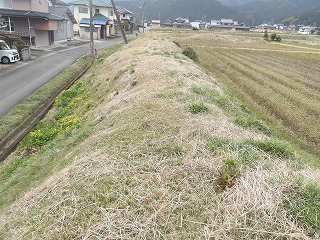 残存する土塁の形状からすると、単郭方形というわけではなく、南側のラインは斜めになっていて、台形に近い形状だったのではないかと思われる。