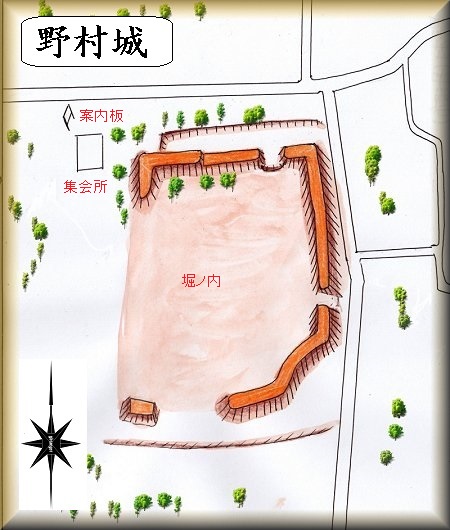 野村城は春日町野村の集落内部にある。館の北側の道路沿いに集会所があり、そこに案内板が設置されている。車も集会所に置かせていただいた。