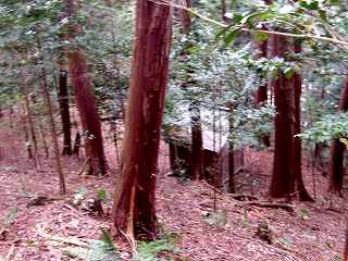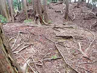 ここから登るのが現在の登城道であるが、むき出しの斜面を無理やりに登っていくような道で、どう見ても本来の登城道らしくない。手持ちの図面を見ると、その辺りから右手の斜面に登っていくルートが描かれているのだが、どうもそのような道が見あたらない。どうやら、本来あった大手道が崩落してしまっているようで、現在はむき出しの斜面に付けられた階段を登っていかなければならないようになってしまっている。