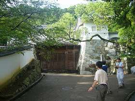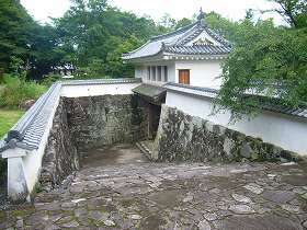 | 龍野城の大手門。 | 大手門の両脇はそれぞれ坂虎口のようになっている。 |