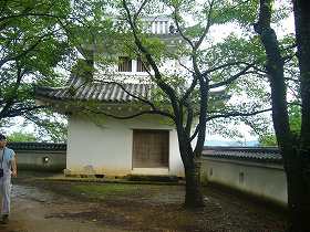| 大手門の枡形構造を内側から見たところ。 | 本丸隅櫓。古図には描かれていないので、どうも模擬のようである。しかし模擬とは言っても木造による建築である。 |