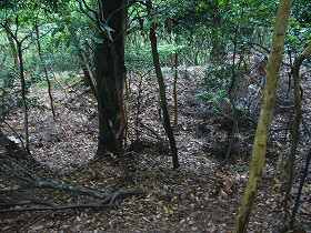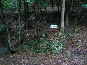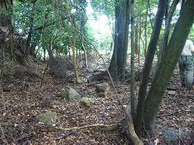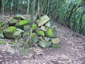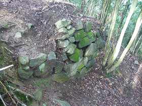 | 西側のだいぶ下にある竪堀の跡。中世城郭的な匂いの強い部分である。 | 降りるときは西側の神社参道を通ってみた。それにしてもけっこう距離が長い。途中に侍屋敷跡の石垣というのがあった。 |