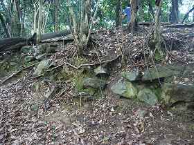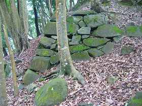 | 本丸西側下の石垣。 | さらにその下の郭にあった石垣。この脇を通って上がるようになっていたらしい。これは櫓台であったかもしれない。 |