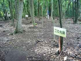 山麓の城の奥から登り始めると、途中で一ヶ所、郭のような削平地が見られた。しかしそれが本当に郭であるのかどうかはよく分からない。さらに歩いていくと、横堀状の郭があり、その上に2段ほどの小郭がある。さらにその上のまとまった広さの部分が「二の丸」と看板がある所である。
