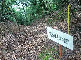 | 搦め手の登り口から見た模擬櫓。 | 本丸の奥から、山上の詰めの城にもがんばって登ってみた。下からの比高は150mである。これは途中にあった横堀形状の腰曲輪。 |
