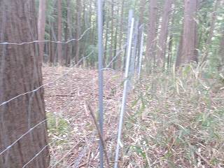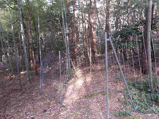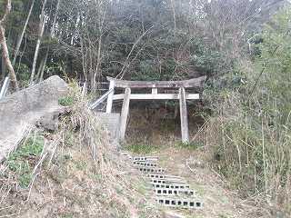 住宅の間を抜けて行った所に鳥居が建てられていて、獣除けの柵を開けて中に入っていく。神社の参道ということで歩きやすい山道になっているのかと想像していたのだが、近年では通る人もまれだと見え、けっこう荒れてしまっている。
