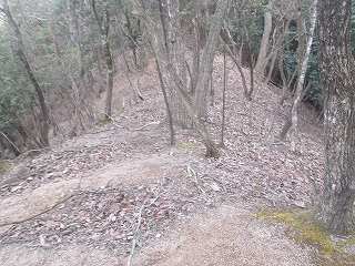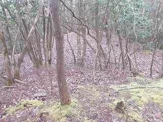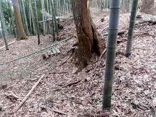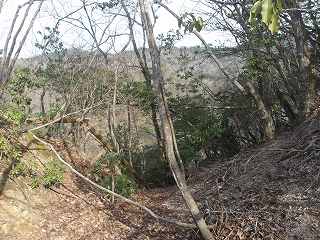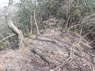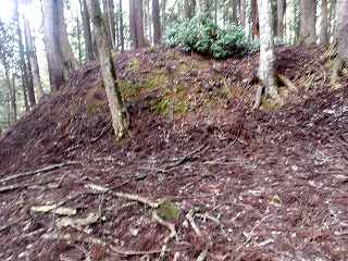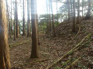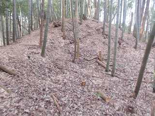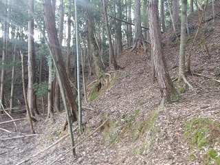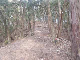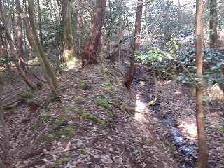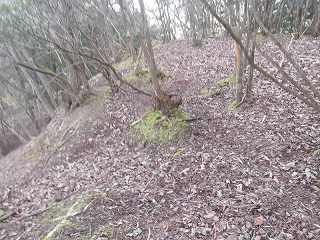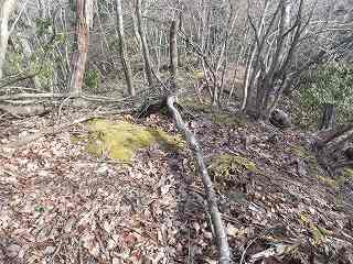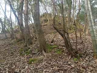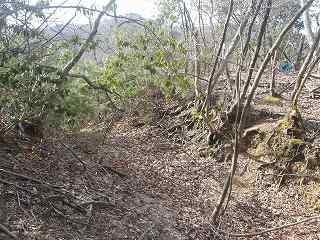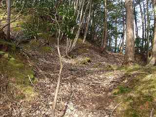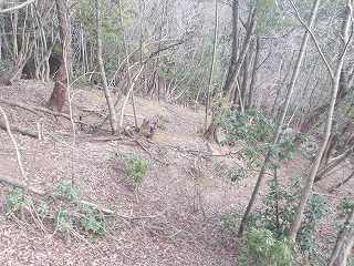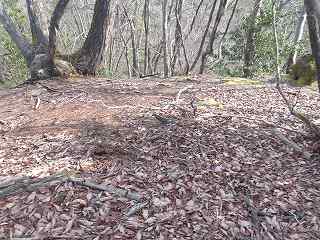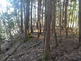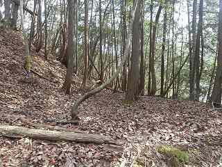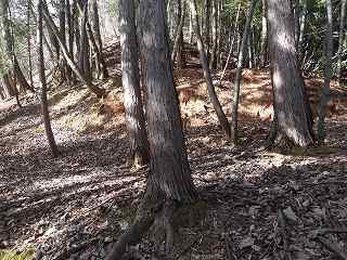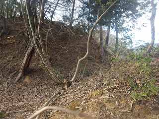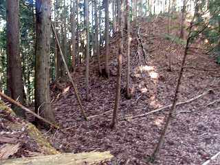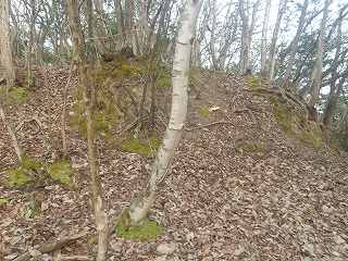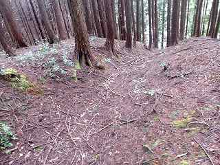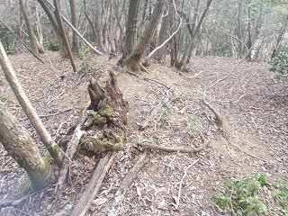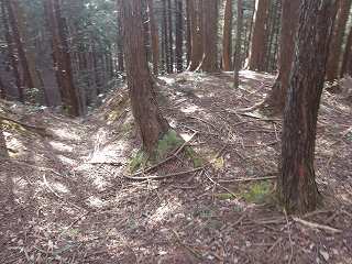 しばらく登って行くと2段のテラス状の郭の所に出た。尾根からはかなり下の中腹部分である。そこからさらに登って行った所に小郭と堀切があり、その上のピークが3郭となっている。