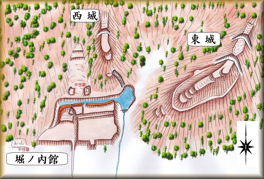堀ノ内館の東側の比高50mの山稜には東城が、北側の比高30mほどの山稜には西城が築かれており、2つの詰の城が館の背後を守るという形勢になっていた。
