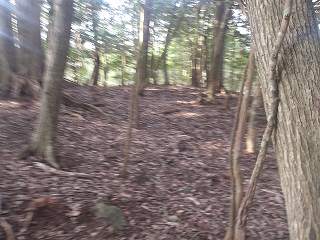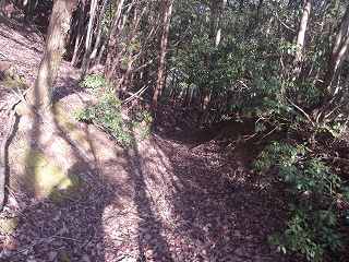 2郭の先が鋭い堀切になっており、側面部から回り込んで下に降りていく。その先が3郭。おばさんお勧めの畝状竪堀は3郭の先にあるはずである。