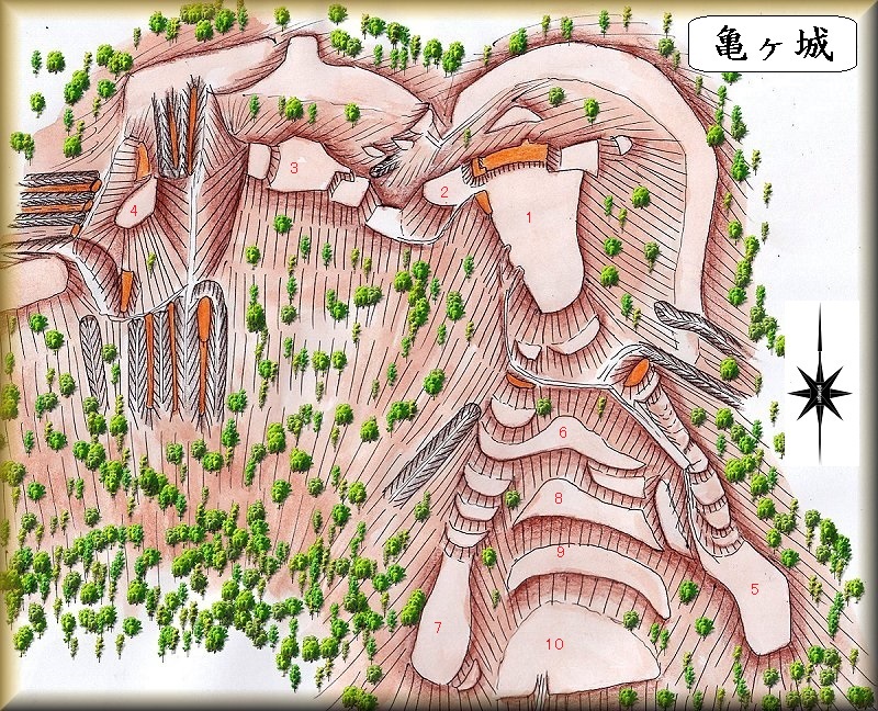 | 亀ヶ城は但馬国守護太田氏の代々の居城であった。だが太田氏が但馬守護であったのは鎌倉時代の事であり、現在見られる遺構が鎌倉時代のものだとは到底思えない。 戦国時代に改修されている姿が現状の遺構であると思われる。 ただし、戦国期の亀ヶ城の歴史については史料がなく不明である。 地元では、太田氏は戦国期にも領主として存在していて、天正年間に羽柴勢によって攻め落とされたといった伝承が残されているという。 いかにもありそうなことではあるが、史料では確認できず、確実なことはよく分からない。だが、羽柴勢に攻められた拠点城郭というのは、現在の遺構のありようにふさわしいものではないだろうか。 |