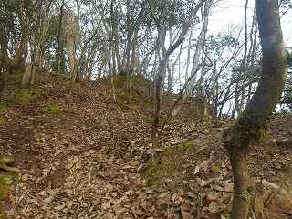 3郭の北側にも堀切があり、その先は天然地形の尾根となっている。それを進んで行った所に堀切があり、前面に城塁が見えている。これを登った所が2郭群である。