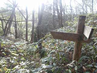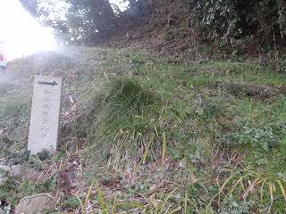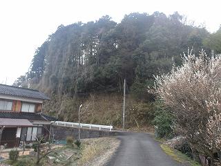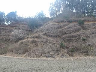 現地の方に「登城口はどこですか?」と伺ったところ、城があったということはご存じではなかったが、「山稜の東側の鞍部から上の墓地に登る道がある」ということを教えていただいた。