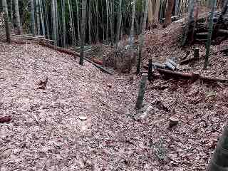 4の側面部から3本の竪堀が掘られていた。その先の南東側が尾根続きになっており、ここに二重堀切が掘られて、尾根との間の分断を図っていた。