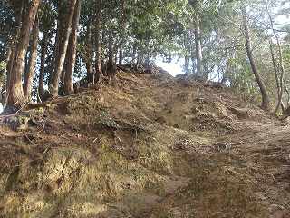 墓地から登って行くと非常に急峻で高い城塁が見えてきた。2郭の城塁である。とても直登することはできなさそうな城塁である。