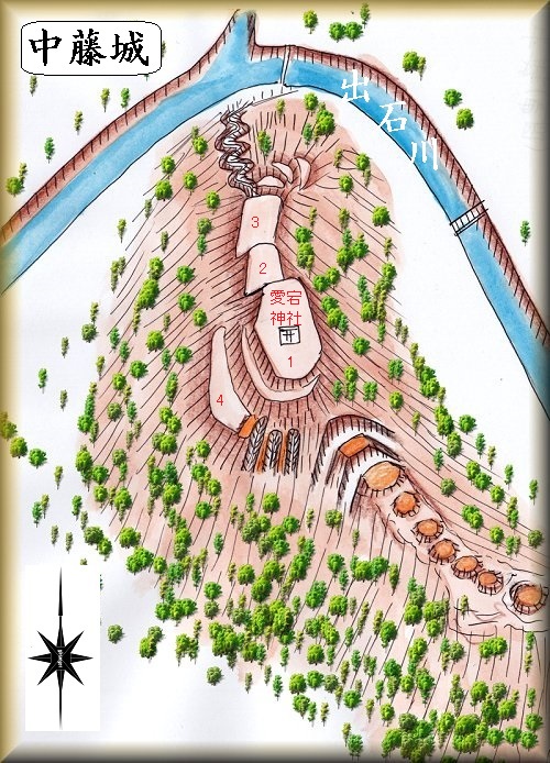 中藤城は、中藤コミュニティセンターの南東側にそびえる比高30mほどの山稜に築かれていた。山頂には愛宕神社が祭られているため愛宕城とも呼ばれているようである。