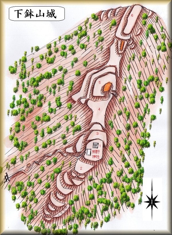 下鉢山城は、下鉢山の集落の東側にそびえている比高50mほどの山稜に築かれている。