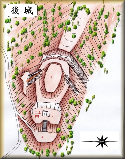 神社の背後には3郭がある。さらに小郭があり、その先は鞍部の4郭となっている。