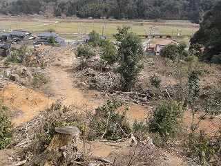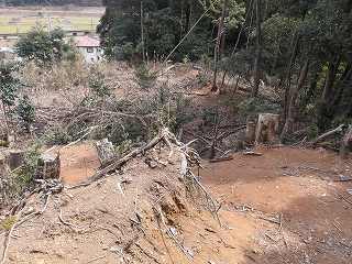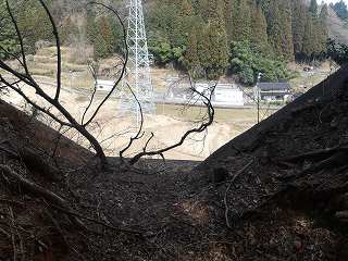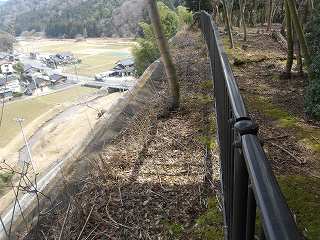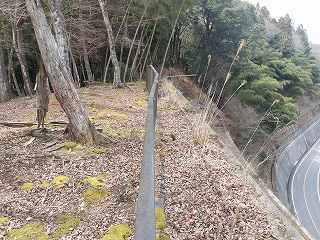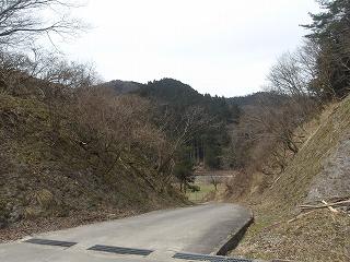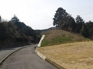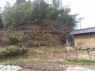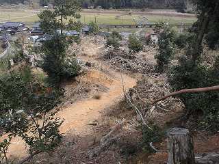尾根基部分に堀切が入れられていたようだが、現在ではここに車道が建設されているために、かつての堀切はかなり大きく削られ、2郭も半分ほどは失われてしまっているようである。