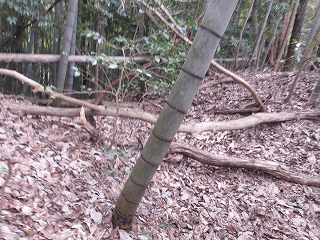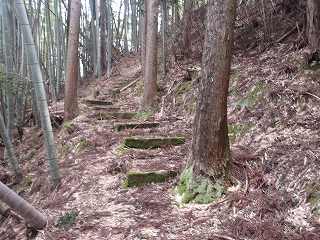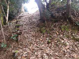 2郭からら1郭への登城道には階段が付けられていた。だいぶ壊れてしまっているが、一度は登城道を付けて整備しようとしたことがあったらしい。ただし、2郭まで登ってくる本来の登城道がどこから付けられているのかは確認できていない。