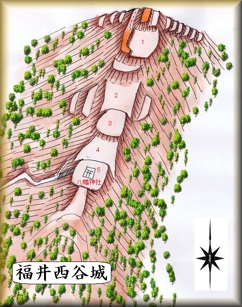 福田城は、福井西谷城のすぐ北東側にある比高50mほどの山稜に築かれている。福井西谷城との位置関係からして、何らかの関係があった城であったと思われる。