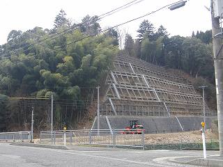 北側の斜面が削られて崩落防止工事が施されている山稜である。