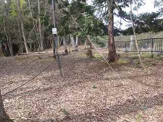 城の東側の下には駐車場があったので、車はそこに停めさせていただいた。城址方向を見てみると、山稜下部の辺りにロープが張られているのが見えている。