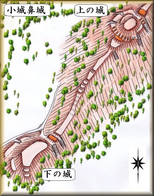 小城鼻という地名の所にあるが、「小城」は「小さい城」というよりは「古城」を示しているのではないかと考える。「鼻」というのは先端部のことで、下の城の事を示しているのかもしれない。