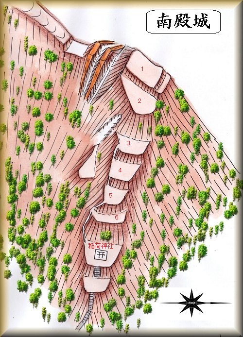神社から左手に回り込んで急斜面を登って行く。その先には6,5,4,3といった段々の郭が形成されている。実に単純な構造であり、段々の郭を形成しただけのものである。