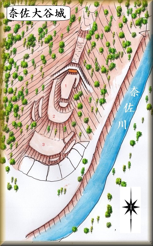 奈佐大谷城は、大谷の集落の背後にそびえている比高30mほどの山稜先端部に築かれている。
