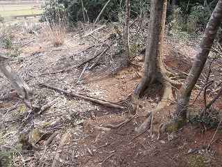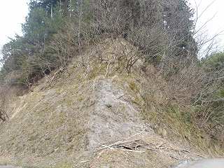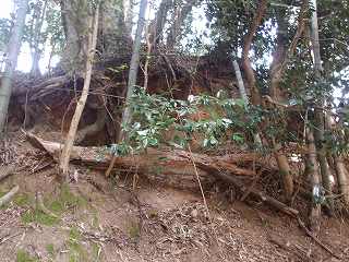 | 堀切を拡張した現在の切通し。 | その壁面部。2郭部分まで削り取られてしまっている。 |
