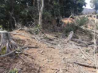 重機の道は北側から登ってきているようである。そのまま尾根基部の方まで道は続いており、堀切部分も埋められてしまっているように見える。