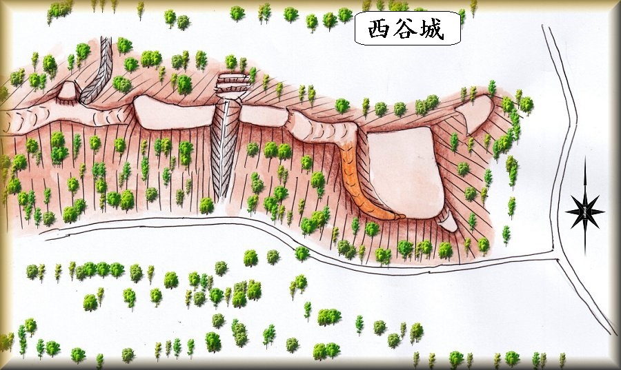 竹野町須谷の集落の南側にそびえている比高20mほどの山稜が西谷城の跡である。
