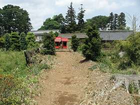 しかし、後でよくよく見れば、この、民家と見えたのは稲荷神社であった。民家の一部をそのまま神社にしたようなので、裏からだと神社にしか見えない。この土手が見えてきたら左手に入っていくとすぐに稲荷神社の入口が見えてくる。空堀があったのかどうか分からないが、単郭の居館の跡である事には間違いなさそうだ。