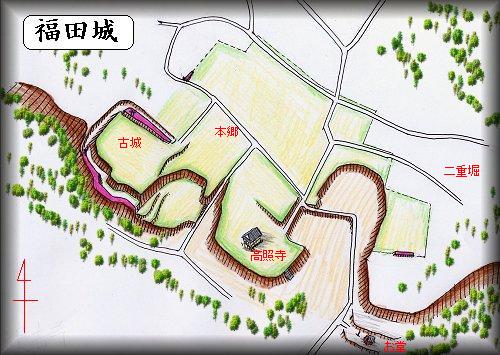 福田城を探すには高照寺を目指していくのがよいであろう。この高照寺も、郭の1つとして用いられていたようで、おそらく3の丸くらいにあたるであろう。高照寺は30m×50mほどの郭で、台地先端の南側は比高7mほどの切り立った土手になっている。また、阿見町名所百選の案内板もここにある。