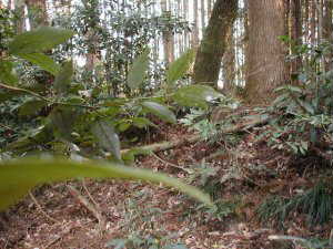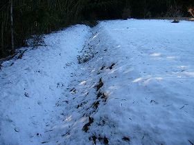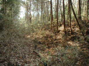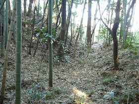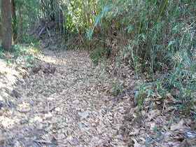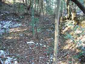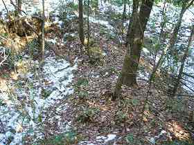 | 主郭部の入口脇にある堀切の跡らしき道。これを南側に降りていくと、Dの土壇のような広場に出る。 | 主郭部にはこのような浅い溝が掘られているが、これは遺構ではなく、耕作のための根切り溝である。 |