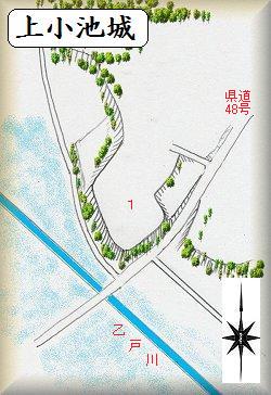 上小池城は、県道48号線脇で、稲荷大明神の西200mほどの所にある。乙戸川に臨む比高6mほどの台地の南端部を利用した城で、この県道が城址の一部を切り通している。「城ノ内」の地名も残っており、城館跡であることに間違いはなさそうである。