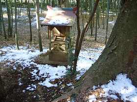 この山中家の次の家と、更にその次の家との間には、奥の竹林に続く細い道が付いている。ここを入っていくと、すぐに鳥居が見えてくる。稲荷神社である。よく見るとこの稲荷は土塁上に建っており、土塁の外側はかなり埋まってしまっているが、堀の跡もある。左手側はちょっと地形が改変され、土塁が取り払われてしまっているが、やはり堀の跡がはっきり見て取れる。