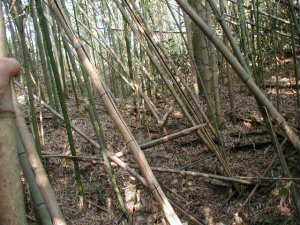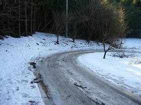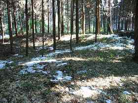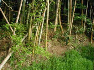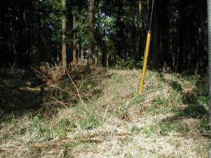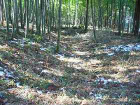 藪の中に少し分け入ってみると、高さ1m余りの土塁が確かにある。1つ不思議なのは、現在の県道と平行した形で残っていると言うことである。これでは街道閉塞用としては使い物にならない。しかし、ひづめさんによると、かつてはこの県道はもっと東西に曲がっていたらしく、旧道に対しては、垂直にまじわっていたかもしれないということであった。