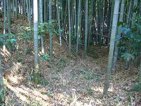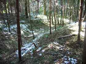 県道近くでは、遺構は失われてしまっているのだが、県道から100mほど進んで藪の中にちょいと入ると、確かに堀があった。深さ2m、幅5m程のものである。西側から来る敵に対して備えたような構造である。